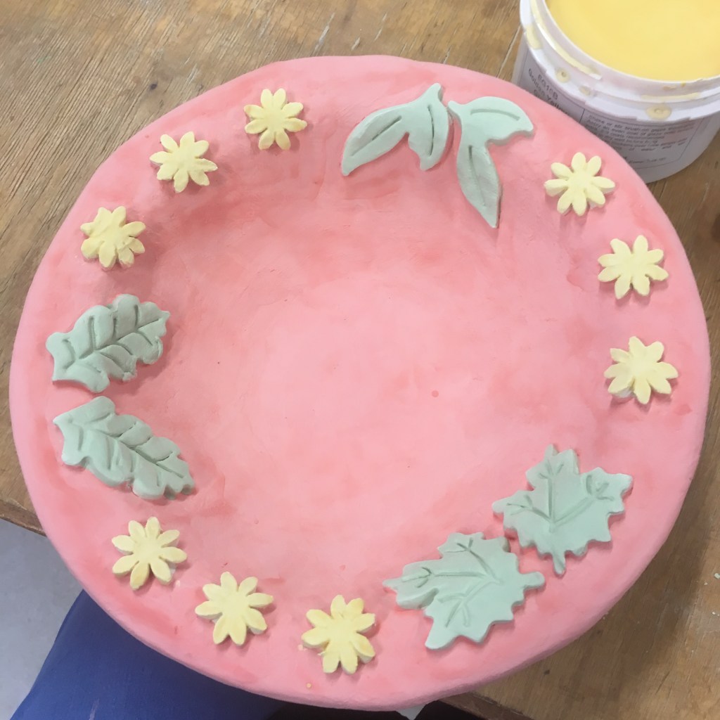Then I got to be creative with mini moulds of leaves and flowers to decorate. One of the other patients had done a lovely design the week before and I used hers to get some inspiration/slightly copied her. Once again, like with the pumpkins, I was drawn in by the activity and enjoyed the feeling of creating something. I am quite a naturally creative person, so I guess it shouldn’t have been a surprise that pottery helped me feel a bit better.
